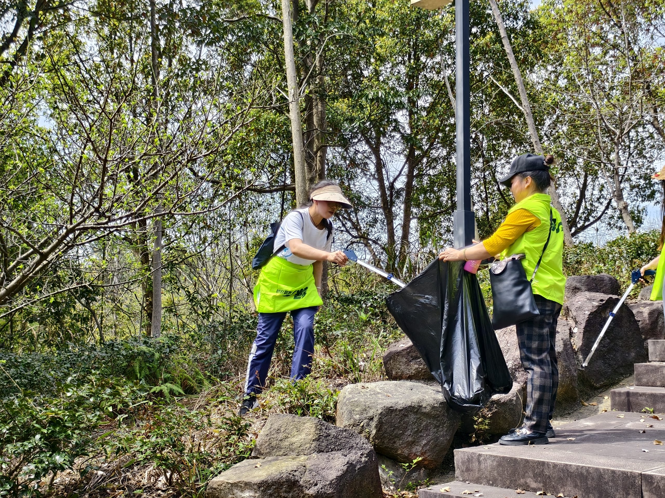 上午九點,所有小伙伴準時乘坐大巴前往海曙區鄞江鎮它山堰,開啟綠色徒步行。走進山林,陽光明媚,天朗氣清。身穿綠色背心的志愿者兩兩一組,分工明確,一個手拿垃圾鉗,一個手拿垃圾袋,仔細搜尋沿途的每一個角落,不落下任何一個垃圾,即使是隱藏在樹林草垛中的垃圾也被志愿者們“收入囊中”。一俯一仰間,他們共收獲了十余袋各色垃圾,經過的每一處,留下的只有青山碧水、綠樹紅花。