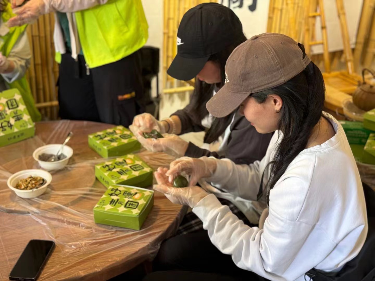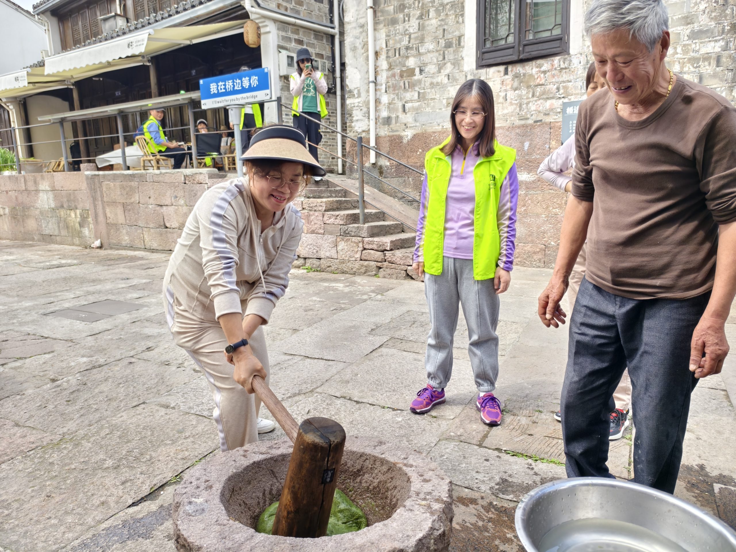 下午,大家親自上手體驗青團制作的過程,品嘗春天的味道。將拌上艾青汁的糯米團在石臼中搗熟,掐一個面團,將自己喜歡的餡料包裹其中,一個綠色的青團就完工了。軟糯可口,清香撲鼻,特別是自己親手做的,顯得更加美味。活動也在歡聲笑語和大快朵頤中進入尾聲。